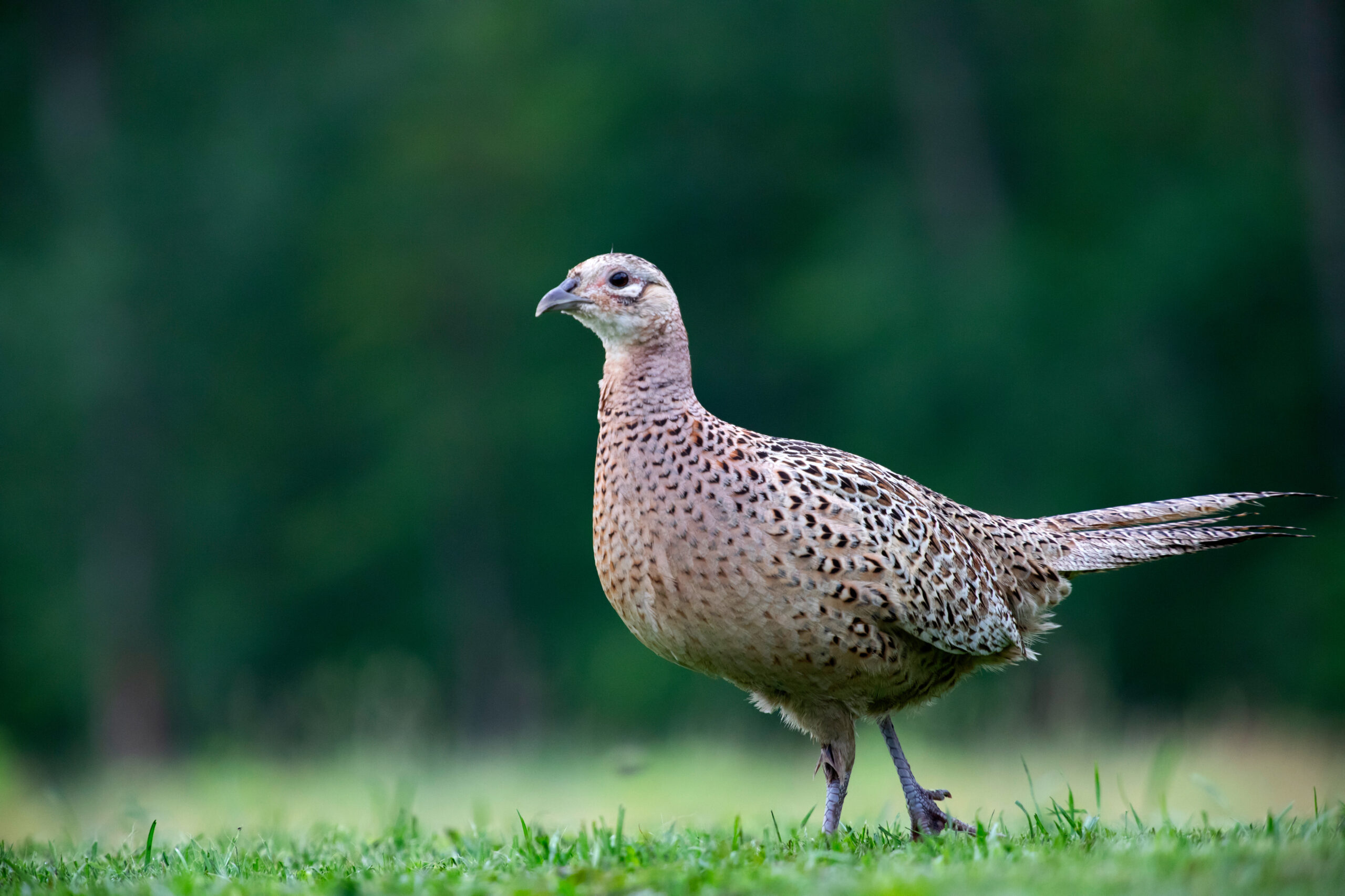 The male golden pheasant is probably the most colorful of all pheasants. Its head and back feathers are bright yellow, the wings are turquoise-blue, and the chest and belly are red. In addition, males have a golden-yellow neck ruff with black stripes, which they can fan out to impress females. The females, on the other hand, have a more subtle, light brown plumage. The golden pheasant originally comes from central China, but today it can also be found in parts of Great Britain.