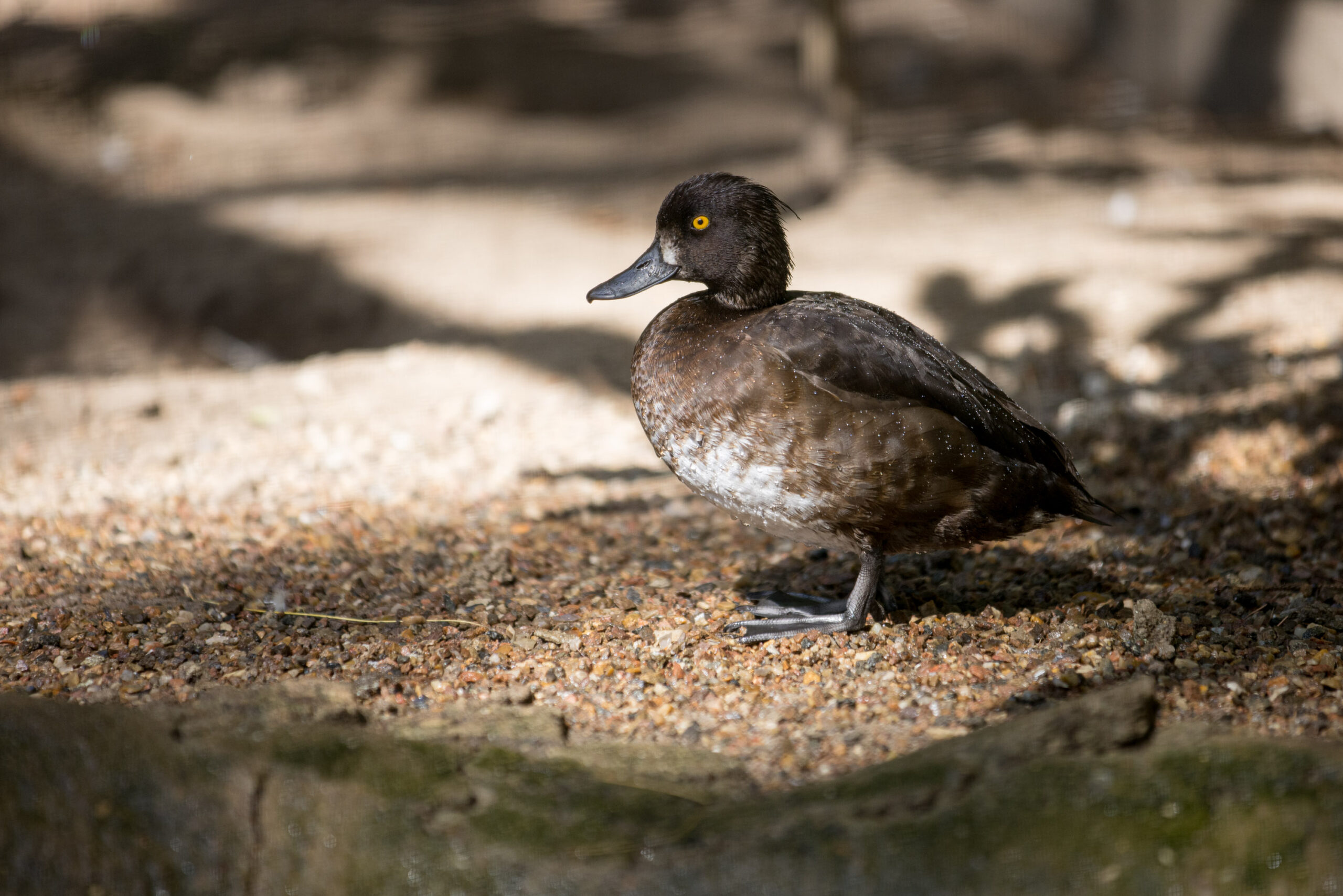 The tufted duck belongs to the so-called diving ducks, meaning it spends a large part of its foraging time with its head underwater. It is considered the most common freshwa-ter diving duck and can dive to depths of up to 4 meters. Males and females are easy to distinguish. The male has a long black crest on its head; in breeding plumage, its flanks and belly are white. The female has a smaller, noticeably shorter crest and is dark brown to black throughout the year. Both males and females also have striking bright yellow eyes. Tufted ducks are quite sociable and are usually seen in large groups.