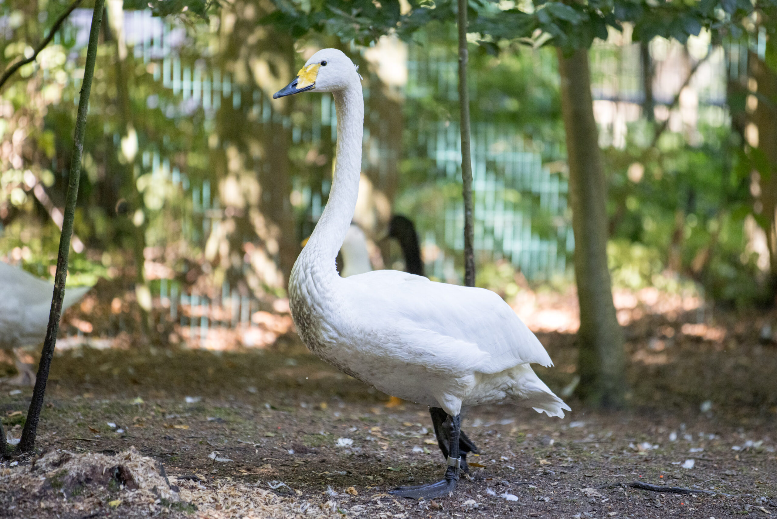 The whooper swan is a large white swan with a characteristic yellow-and-black bill, named for its loud, trumpet-like calls. It is about the same size as the native mute swan, but unlike it, usually holds its neck straight upright.