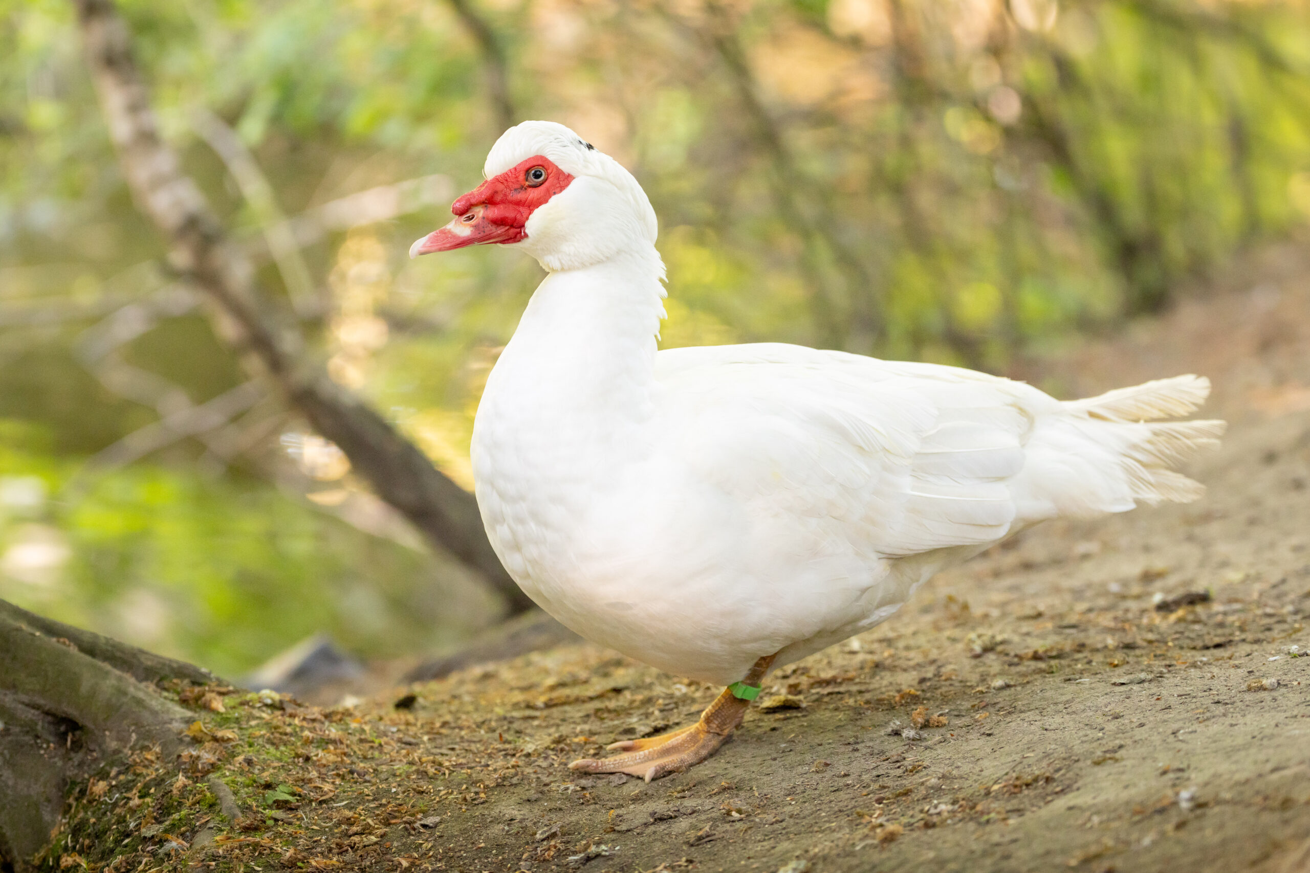 The Muscovy duck does not, like most other domestic duck breeds, descend from the mallard, but is instead the domesticated form of the wild Muscovy duck. It is especially striking in appearance: the skin around its beak and eyes is bare, red, and covered with distinctive, wart-like caruncles that give the duck its unmistakable name. Unlike other ducks, Muscovy ducks do not quack, but communicate using soft hissing sounds.